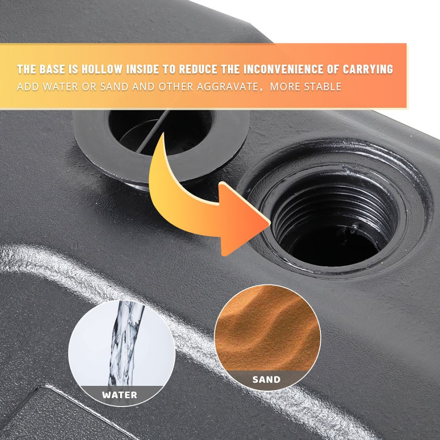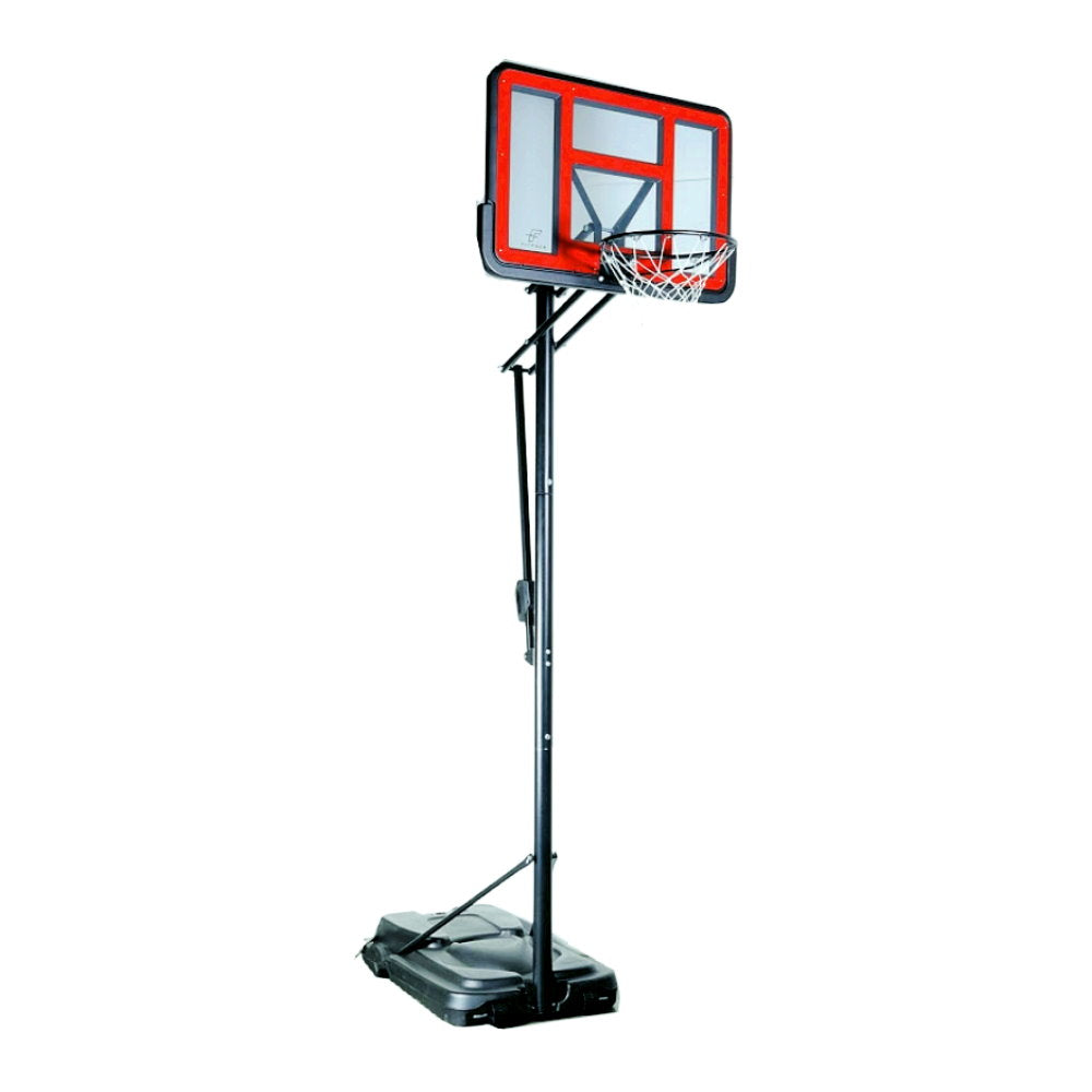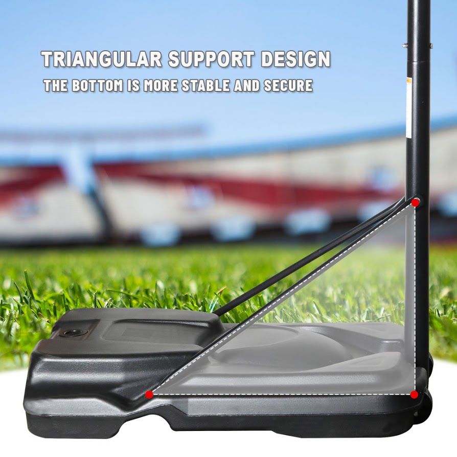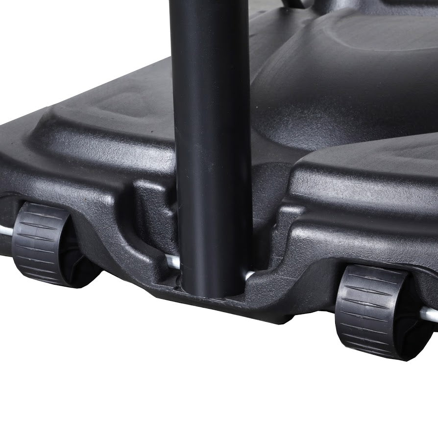 - Transportable Rolling Base The entire system is supported with a blow-molded durable base. Fill with sand or water and play today! To store, or protect strong winds, simply tilt the system forward and roll to your desired location.