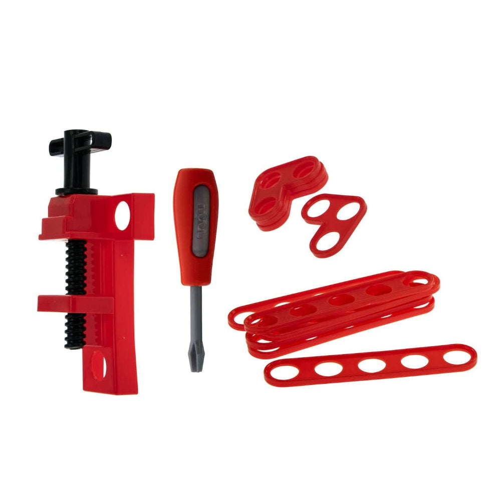The tool set includes a battery-powered drill that actually turns, a hammer, saw, wrench, screwdriver, pipe wrench, 24 nuts and 24 bolts and other pieces to play with and configure the bench.