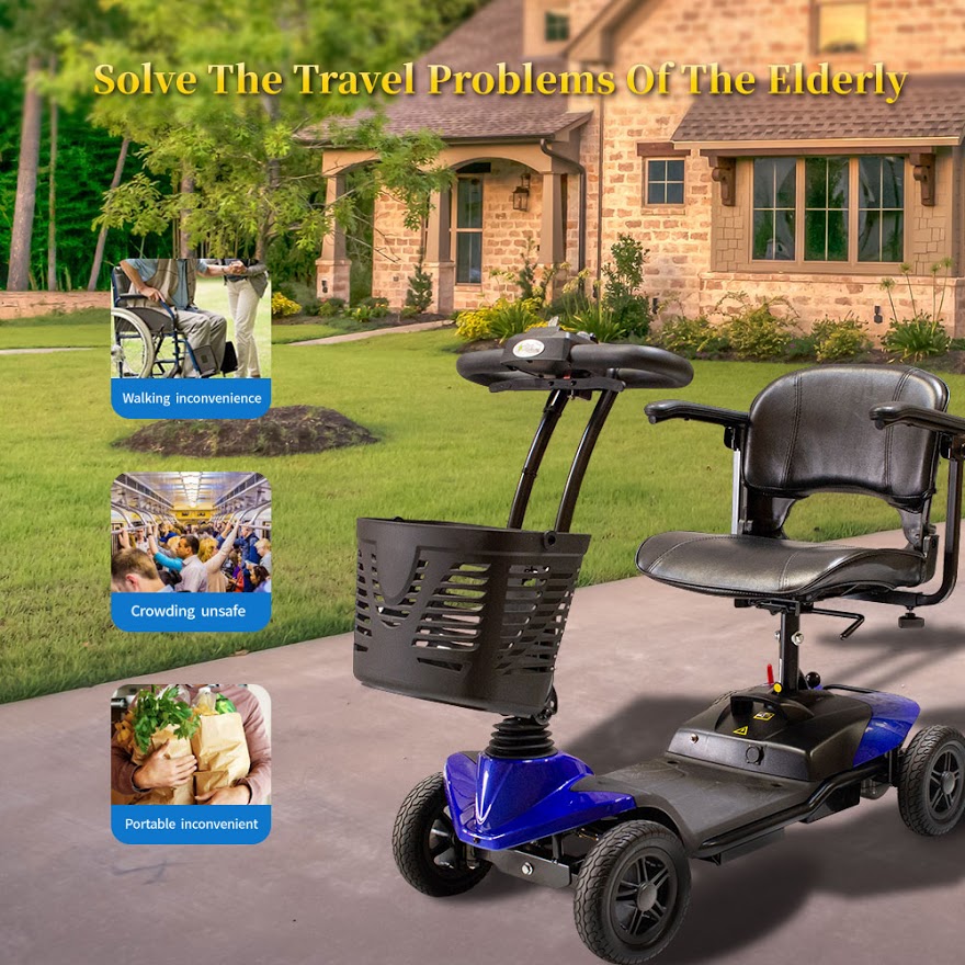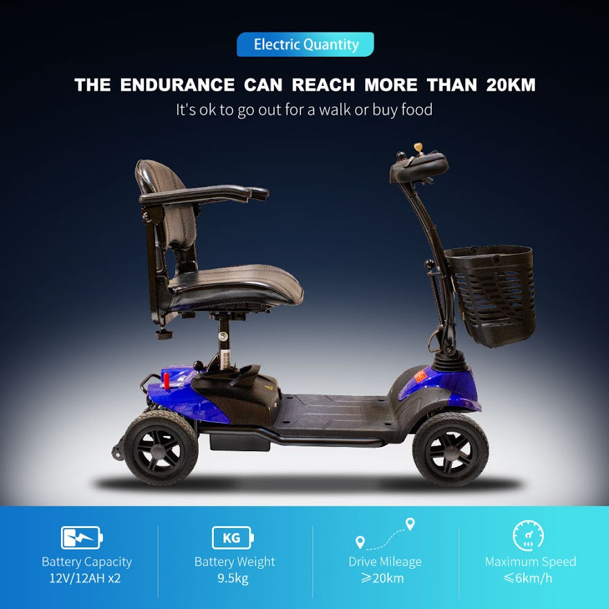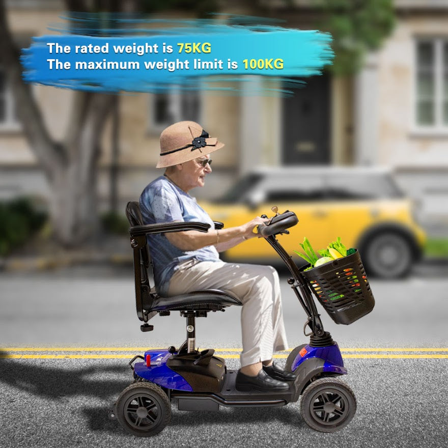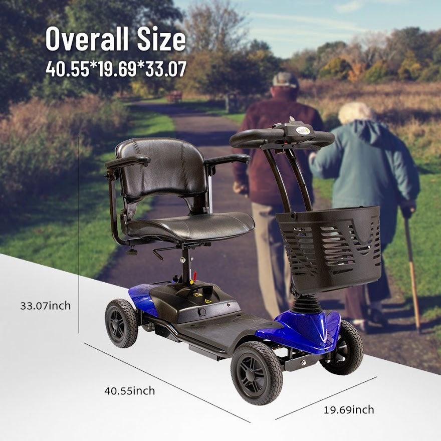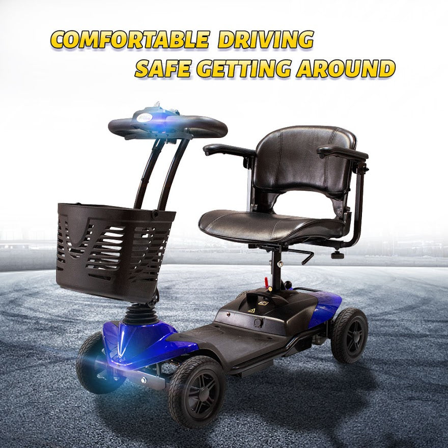 The Skrt RW-M35 4 Wheel Mobility Scooter can travel up to 9 miles which will keep you traveling all day! Equipped with puncture proof tires you never have to worry about the dreaded flat as you travel to your local store. The max speed is 4 MPH which isn’t lightning fast but is adequate and a very safe traveling speed. The RW-M35 lightweight travel scooter disassembles into five lightweight pieces with the heaviest piece only being 30lbs! When disassembled, this electric power portable scooter will fit easily in the trunk of most cars and all SUV's and vans. The removable front basket will hold all your essentials and light shopping. On top of all this, the lightweight RW-M35 4 Wheel Mobility Scooter is manufactured by Skrt who is a world class leader in mobility.